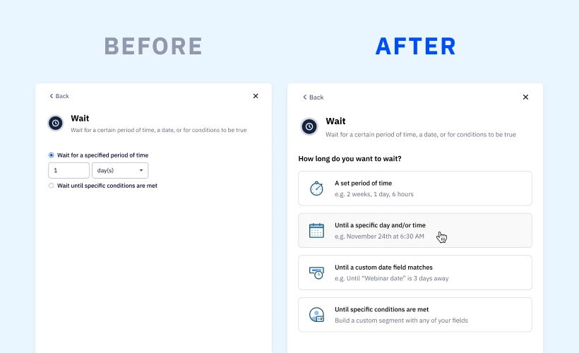 More flexibility + possibilities! Building on our current wait steps, which allow you to wait for a set period of time or until specific conditions are met, we’re excited to introduce two new wait steps:
