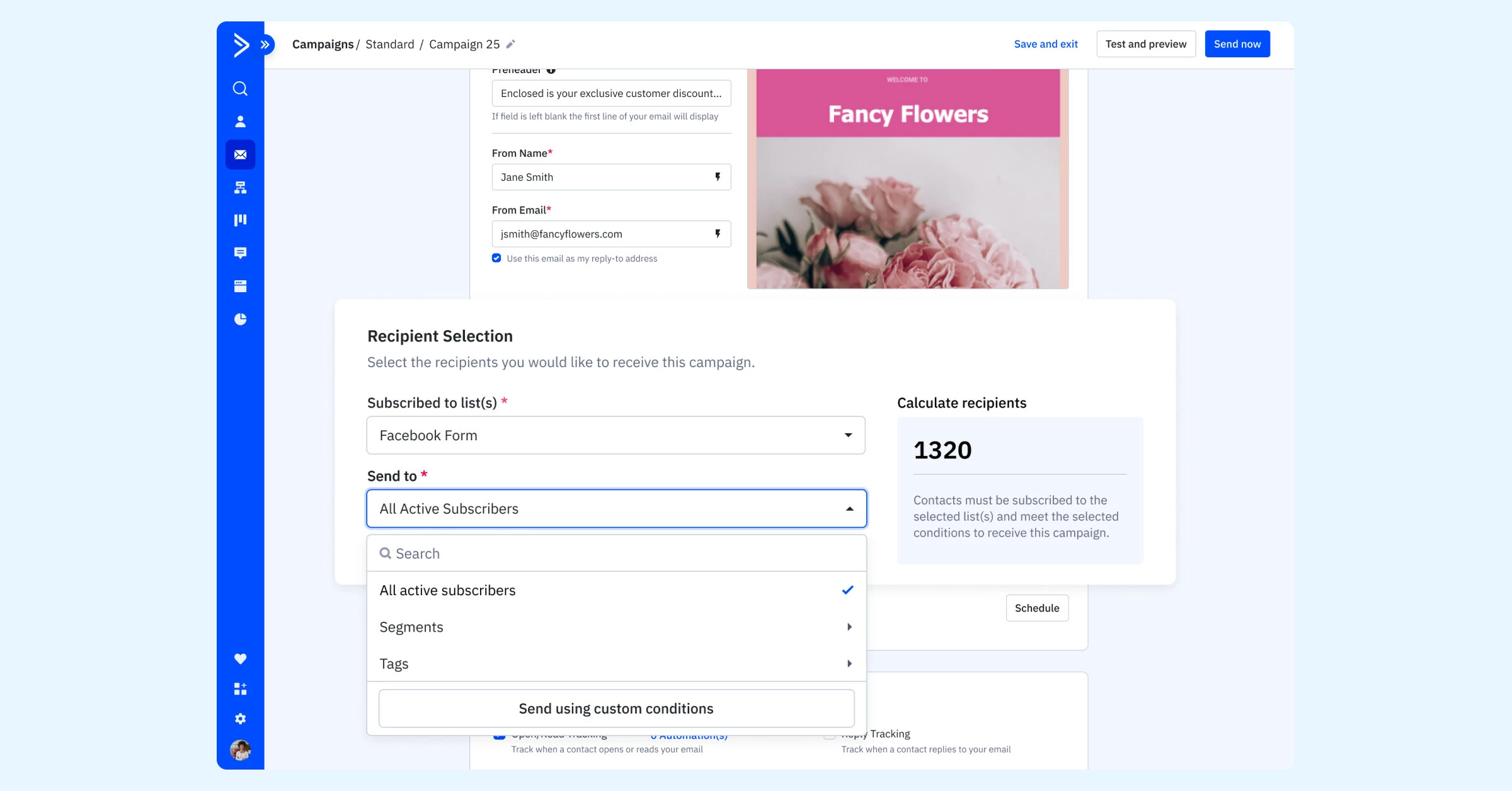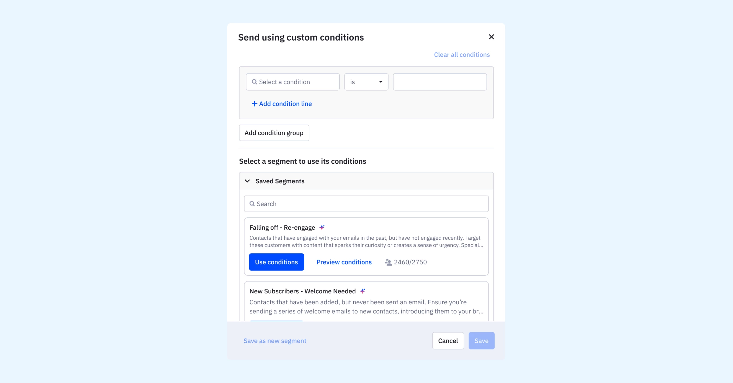 2. Choose to send to segments, tags, or apply custom conditions before the send.