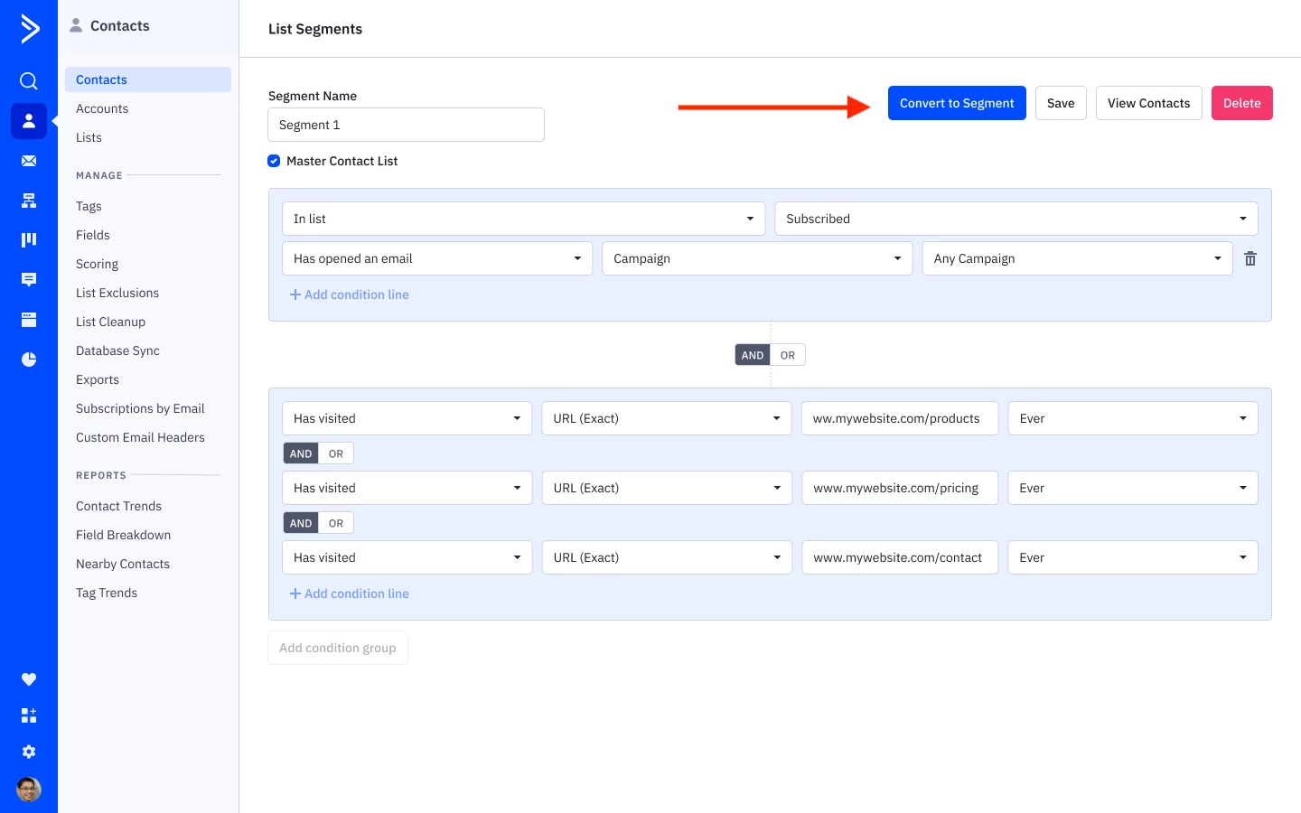 2. Access your segments under lists, you will see a convert to segment button