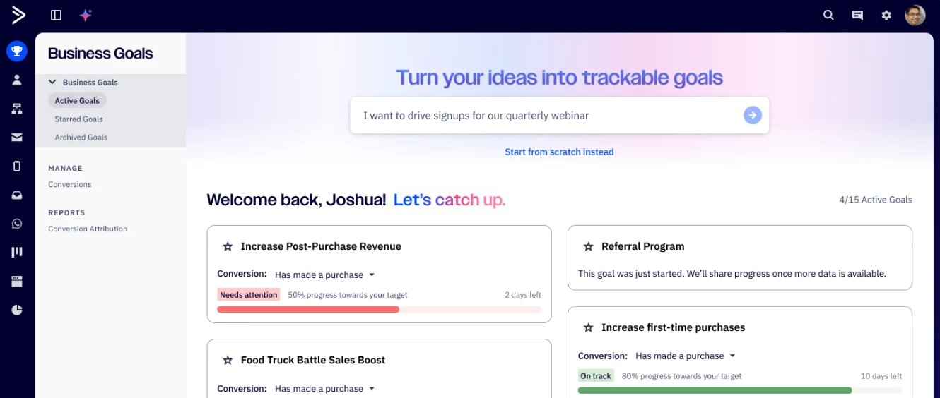 Business Goals now has a dedicated home in your main navigation, making it easier to create, organize, and track every goal that matters to your business.