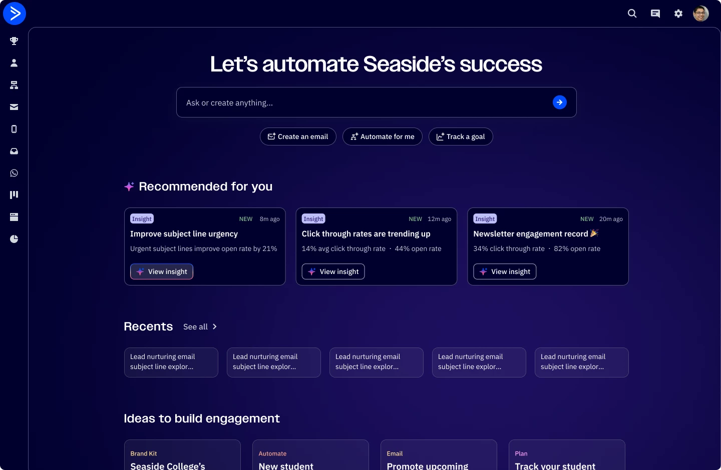We're excited to announce Active Intelligence Insight Cards – get proactive AI insights and recommendations that appear directly on your homepage. Active Intelligence works as your always-on marketing partner, autonomously analyzing your email campaign performance and surfacing weekly insights with actionable next steps to optimize campaign engagement and drive results.