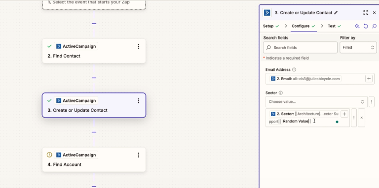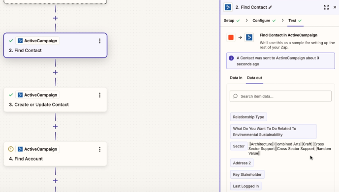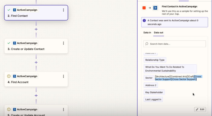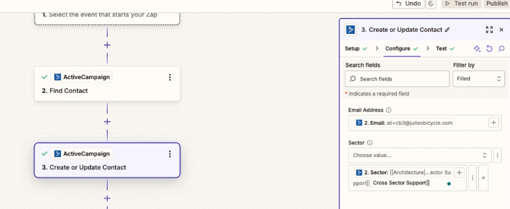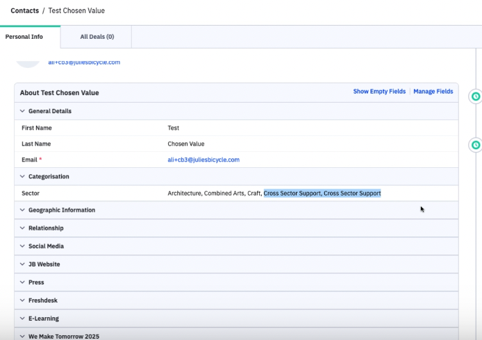 Example: Contact has “Cross-sector support” selected → Zapier automation appends “Cross-sector support” again → Field shows “Cross-sector support” twice in the interface, even though functionally only one checkbox is selected. The duplicate value is returned in subsequent Find Contact responses.